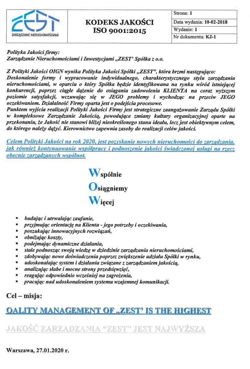 Z Polityki Jakości OIGN wynika Polityka Jakości Spółki „ZEST”, która brzmi następująco: